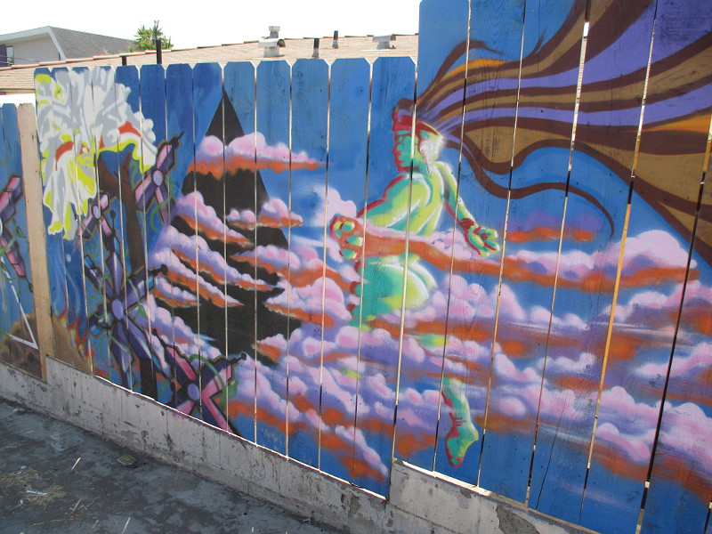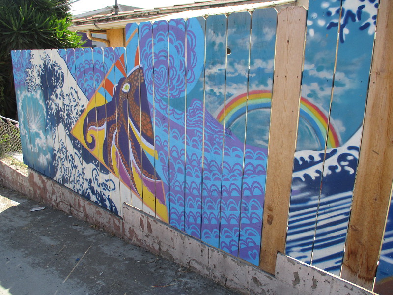 The spray painted mural contains much colorful imagery, from an octopus and ocean waves to a hummingbird and prickly pear and the moon and brilliant jewels and a human figure among clouds and a rainbow. I looked for an artist’s signature but didn’t see one.