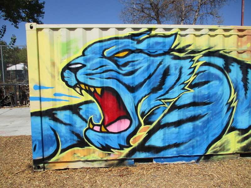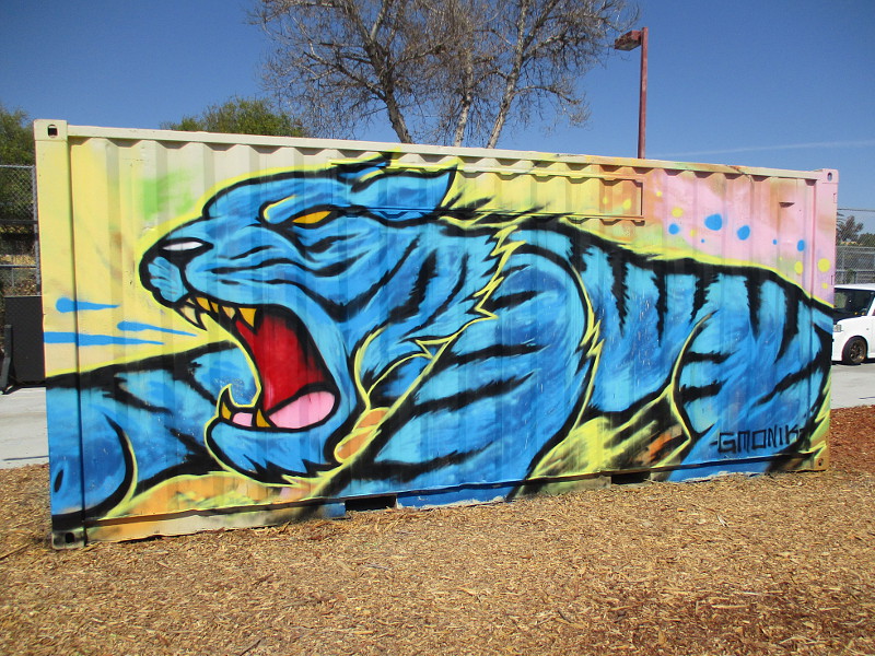 You can see this bold new artwork on University Avenue, just east of Interstate 15, in an outdoor space where a variety of community events are held. It’s a fierce new mural on a shipping container painted by artist GMONIK!