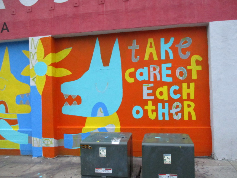 The fun, very colorful mural has a positive message: take care of each other. It was painted by Hanna Gundrum (@littlehouseink).