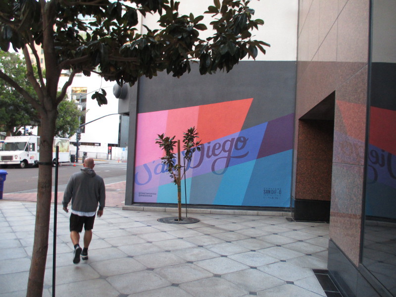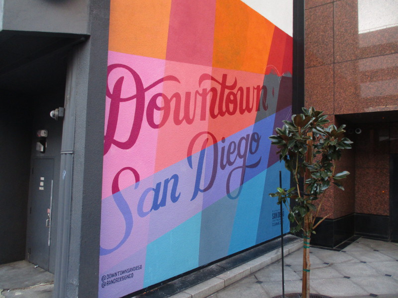 Pandr Design is in the process of painting this artwork near the windows of the Downtown San Diego Partnership, which is located on the ground floor of the Wells Fargo building.