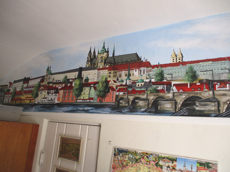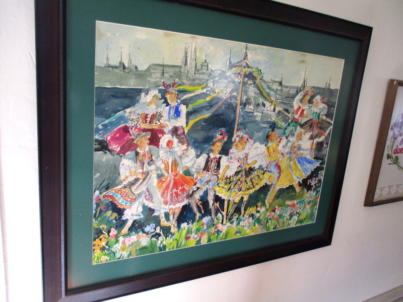 I stepped into the House of Czech and Slovak Republics cottage and discovered a beautiful painting on one wall of Prague. And artwork depicting folk costume and dance!
