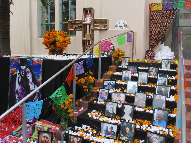 This morning I walked down to the San Diego County Administration Building to view their Day of the Dead altar. Like the one last year, this new altar on some outdoor steps remembers those who’ve died from COVID-19.