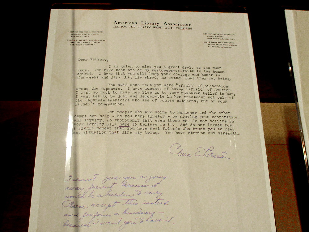 The exhibit recalls how San Diego librarian Clara E. Breed comforted and advocated for those American citizens of Japanese ancestry who were sent away to internment camps during World War II. She particularly helped and encouraged the children, with whom she kept in communication. Part of the exhibit includes many of her letters.