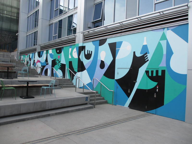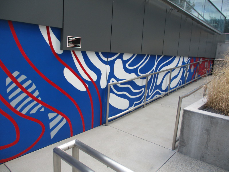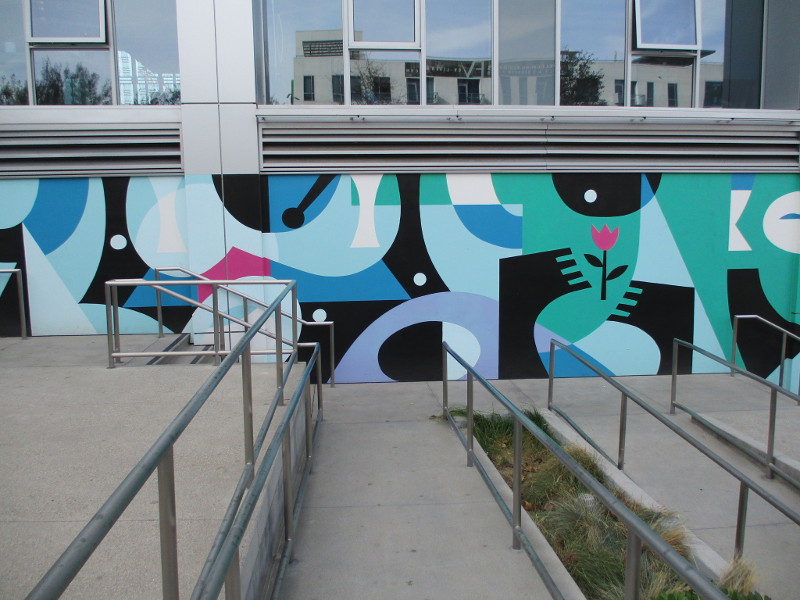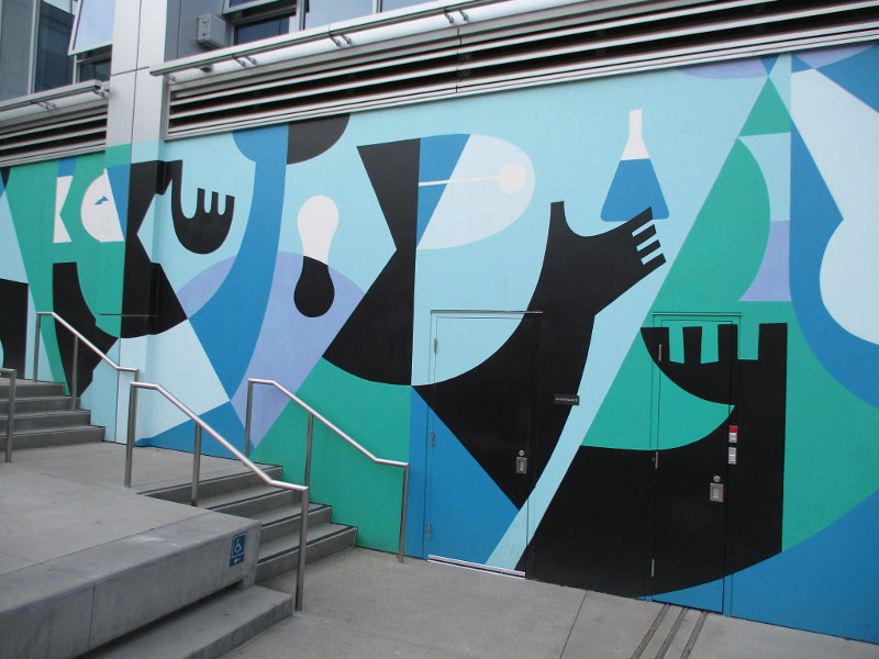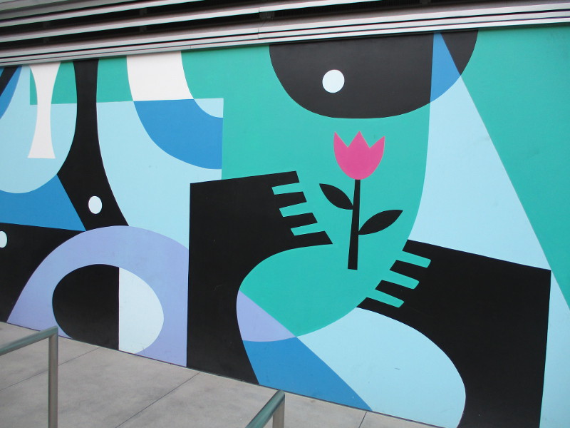 The next photos are of the mural on the plaza’s east side, by artist Joel Sotelo. The mural’s title is Pulsar Ultra-Marino. According to a plaque I found, “Sotelo’s colorful mural is based on the idea of wonder, from the micro to the macro, from the beauty of nature to the revelations of science.”