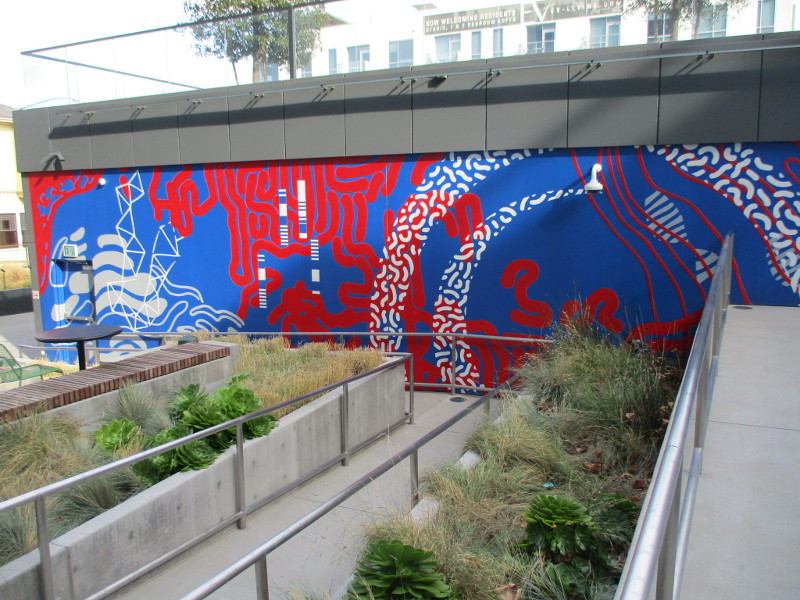 The murals, designed by artists Rafael Lopez of San Diego and Joel Sotelo of Tijuana, decorate opposing walls in the amphitheater-like space between the UCSD Downtown Center building and the 34-story The Merian apartment tower. Walk north up the sidewalk from the corner of Market Street and Park Boulevard and you’ll find it.