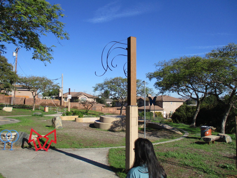 As we walked through the park, I learned the wavy metal sculptures on posts were created by Sweetwater High School welding students, and the log benches were the work of former National City Mayor Ron Morrison.