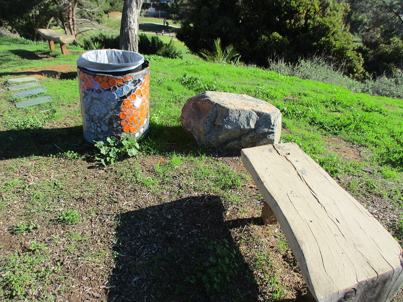 I learned how, during the course of several days, families from throughout the neighborhood, school students, the Kitchenistas of Olivewood Gardens, and even the mayor of the time worked in the park installing butterfly beauty: mosaics on benches, a table and a trashcan, beautiful metalwork on posts, and an outdoor stage shaped like a butterfly wing! Vegetation that attracts butterflies was planted, too!