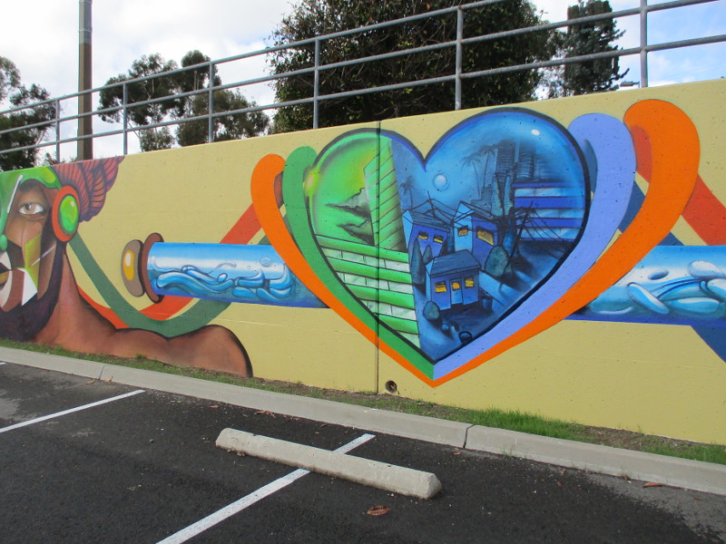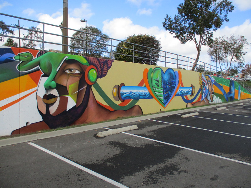 Some very colorful abstract art was spray painted last month on a long wall beside the Massachusetts Avenue trolley station parking lot. The artist is Maxx Moses, whose distinctive work can be found all over San Diego.