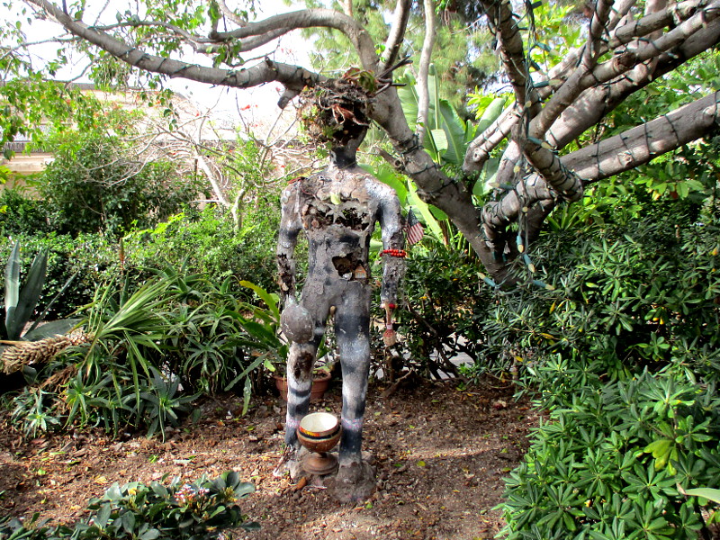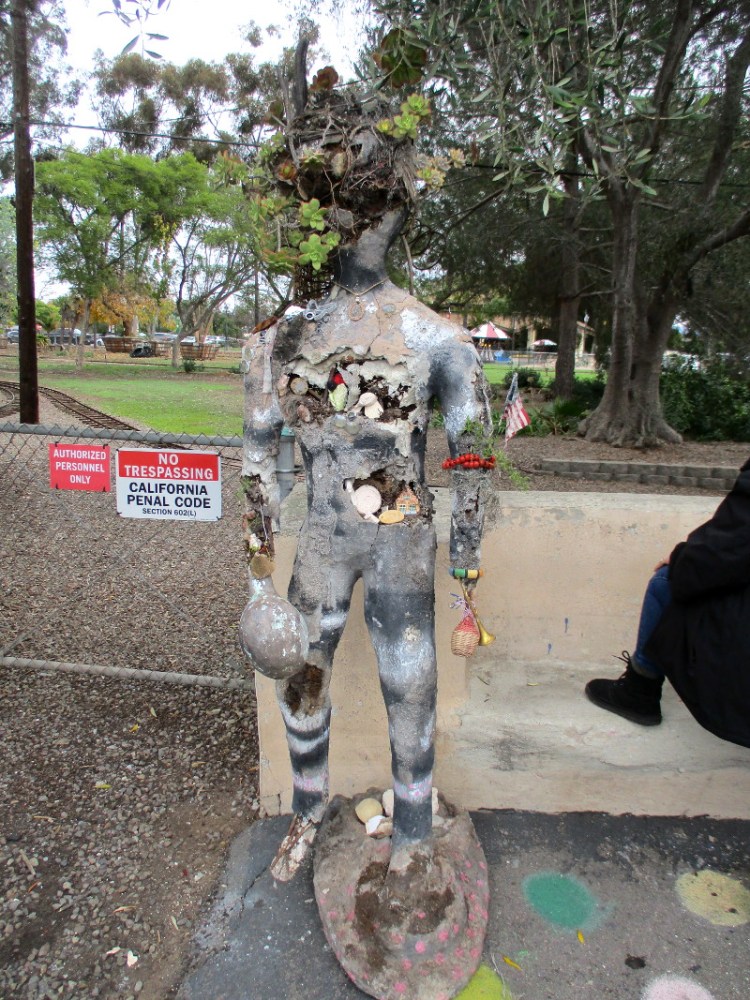 But I got one more smile. Because in the parking lot to the side of her old studio, next the Balboa Park Miniature Railroad’s fence, like an ancient living guard, one of her wonderful, whimsical sculptures still stands.
