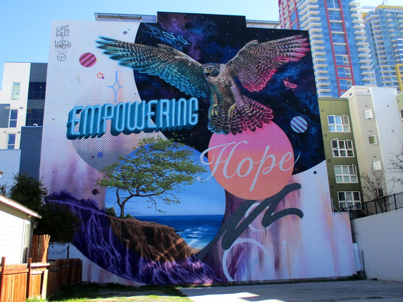 A huge, absolutely amazing mural in downtown San Diego’s East Village has been painted right next to the Quartyard. The mural is in support of wildlife conservation efforts, and is titled Empowering Hope. The artists are Carly Ealey and Christopher Konecki.