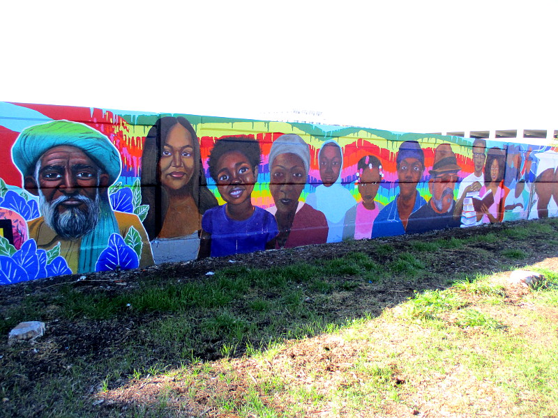 Last time I photographed the mural-in-progress, several faces at the left end had been finished. Since then, more faces have been completed! And other painted details throughout the very long mural are appearing as well.