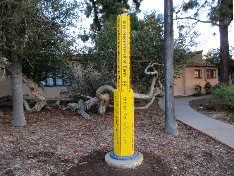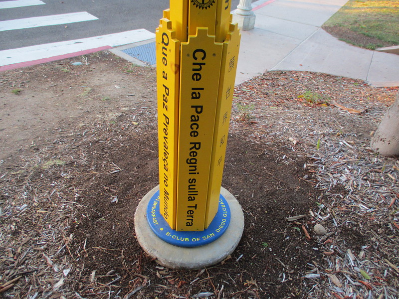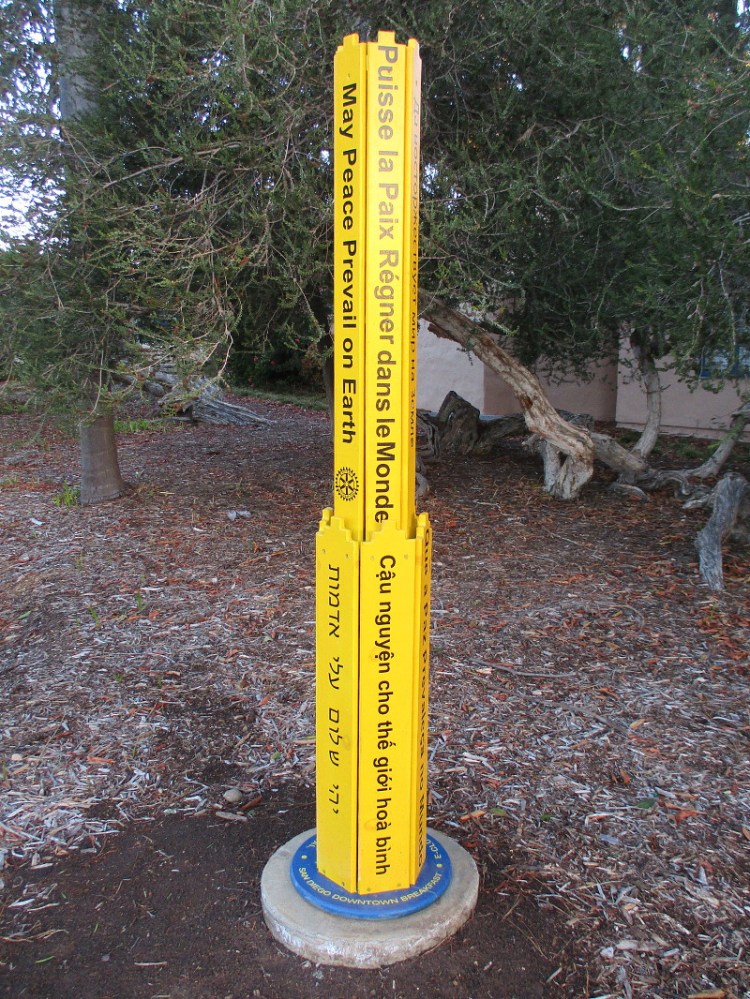 The Peace Pole, which contains the message “May Peace Prevail on Earth” in many languages, is the project of Rotary E-Club of San Diego Global, San Diego Downtown Breakfast Rotary Club and the international Peace Pole Project.