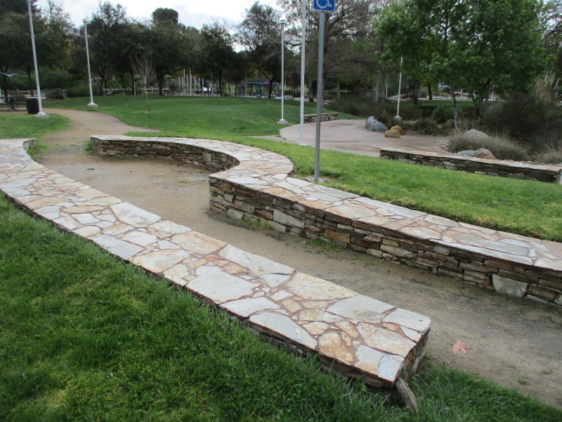 Briercrest Park, at 9001 Wakarusa Street, was purposely designed to be wheelchair friendly. Paths winding beneath shady sycamores and oaks lead to benches that accommodate those in wheelchairs. A special stone alcove, which you can see in my photographs, was specially constructed for this purpose.