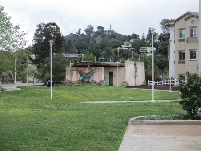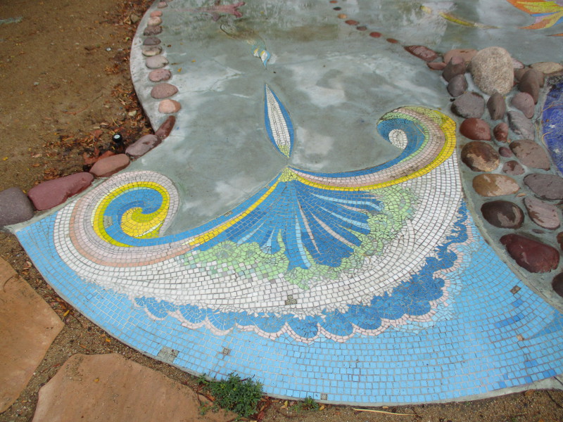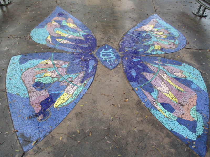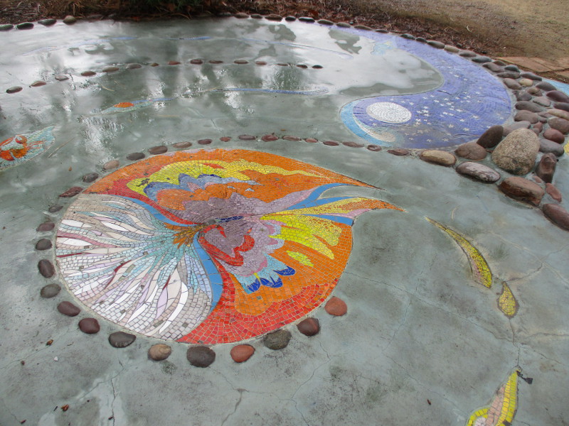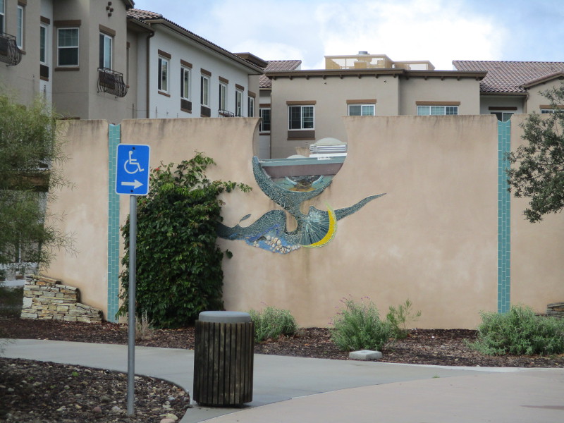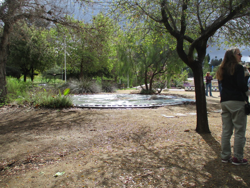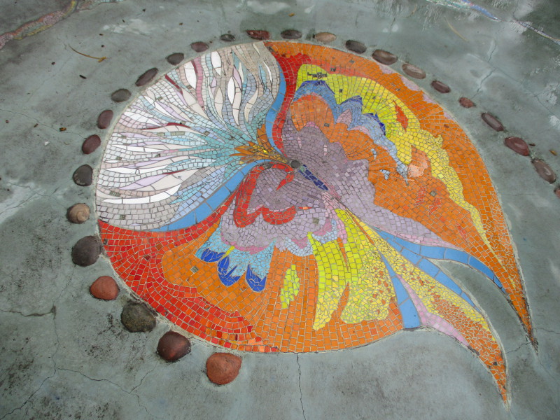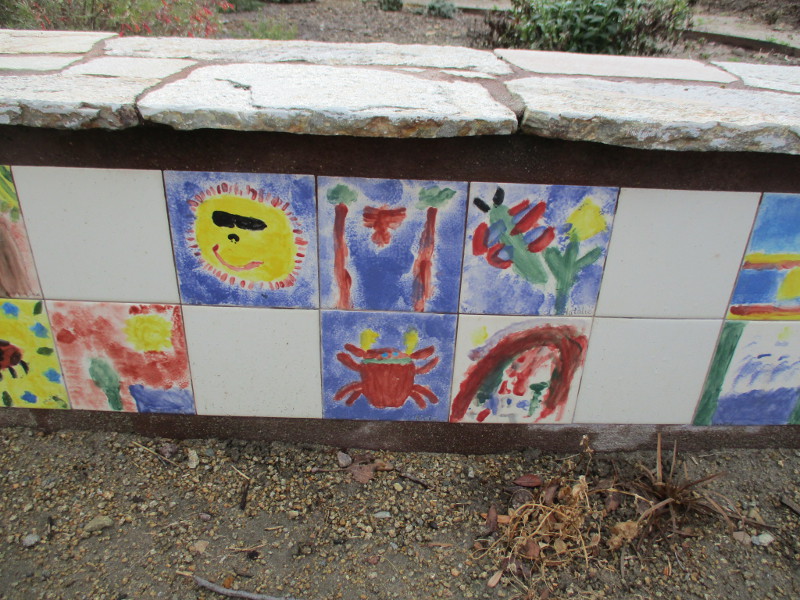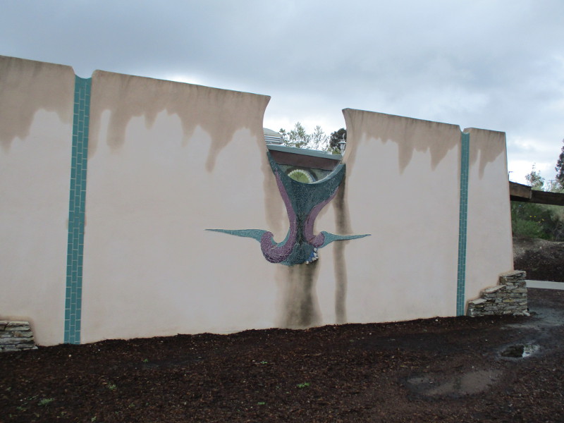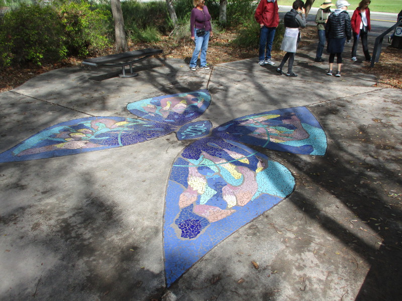 This butterfly glass mosaic was assembled by Emilie Ledieu, one of the artists in residence at James Hubbell’s Ilan-Lael Foundation, located near Santa Ysabel, California, in the mountains east of San Diego.One plaque on a park bench. Live Well – Love Much – Laugh Often…Many benches in the park were designed to accommodate people in wheelchairs.An herb garden, maintained by a local gardening club, provides a sensory experience. I smelled sage.The playground has numerous fun elements, including these critters.Path by the central wetlands, with lots of greenery and boulders and stone benches for meditation.An area of open grass. The unique restrooms are in the distance.Hubbell mosaics can be found on three sides of the beautiful structure, said to be the only park restrooms in San Diego with stained glass!Organic mosaic above and around drinking fountains appear a bit like a watery landscape.Mosaic on one side. The vertical blue lines are like cascading water.The other side. The flowing mosaic almost seems to have the shape of a heron.Stained glass window seen from inside the men’s restroom, made with durable resin.Tiles around another small garden space created by local school children.The very beautiful Hubbell labyrinth. One begins at water, passes through space, and arrives at the bright flaming center.Tables set up for the Open House tour visitors. That’s Emilie the artist in red. People could help build two small mosaics!One of the small example mosaics in progress.A smile!This looks like a very cool book concerning the history of this neighborhood. La Mesa’s Severin Grossmont Hills and Vicinity.We have gathered near the labyrinth for a talk at the beginning of the tour. Look at that sunlight in trees.That’s Glen Schmidt on the left and Drew Hubbell on the right, standing near a small climbing structure.Glen, the friendly landscape architect, explains concepts behind Briercrest Park’s creation.We look at one concept image board. Emphasized are accessibility, the senses, nature, serenity, and even music! I didn’t photograph it, but one area is equipped with outdoor chimes and other musical instruments to freely play.Drew Hubbell leads the way.We stroll through a very beautiful park.