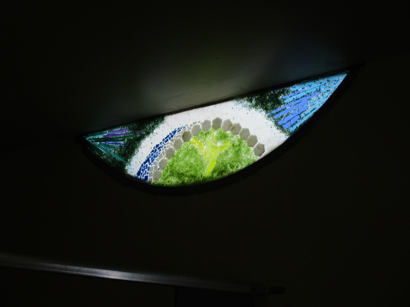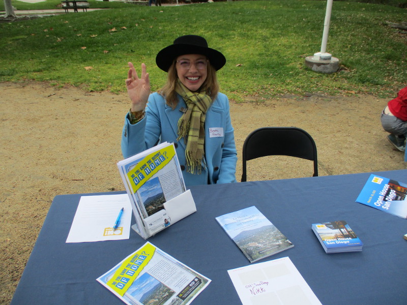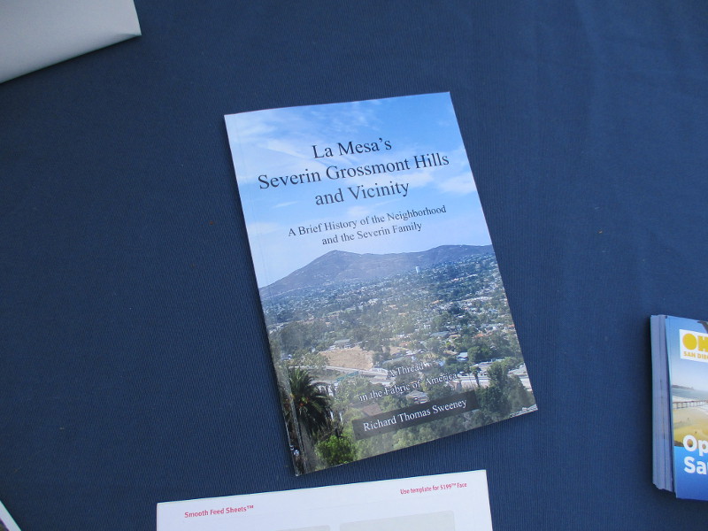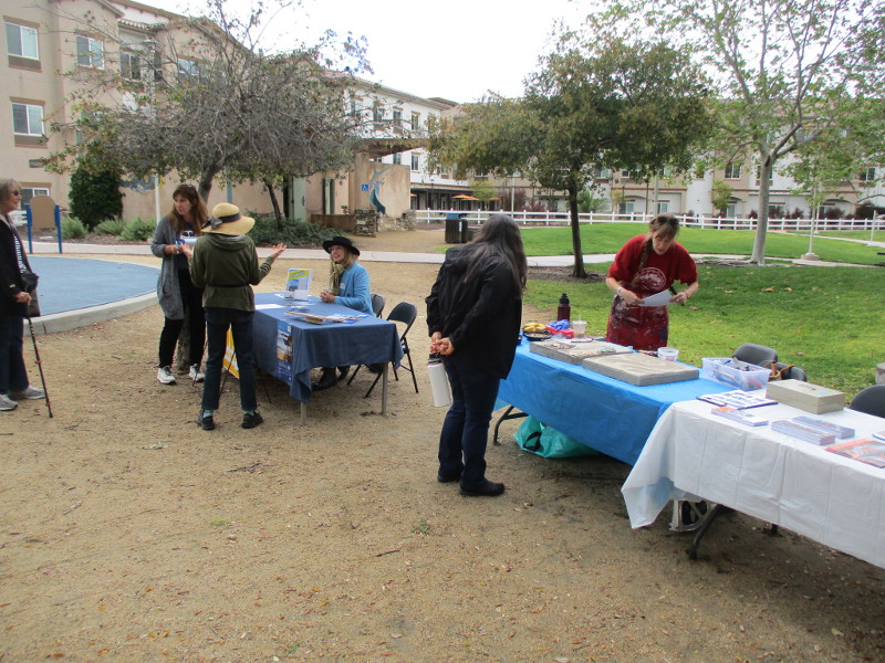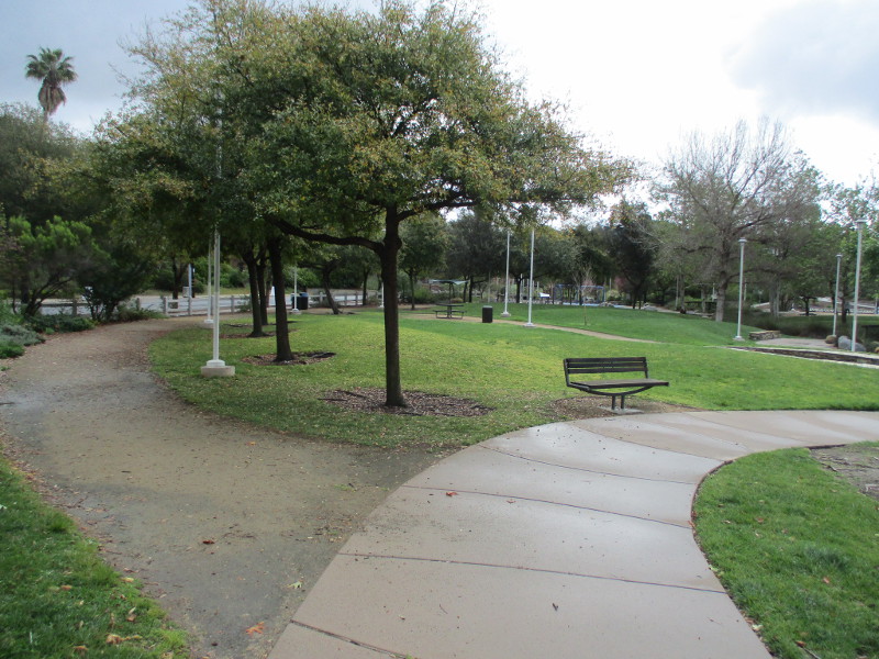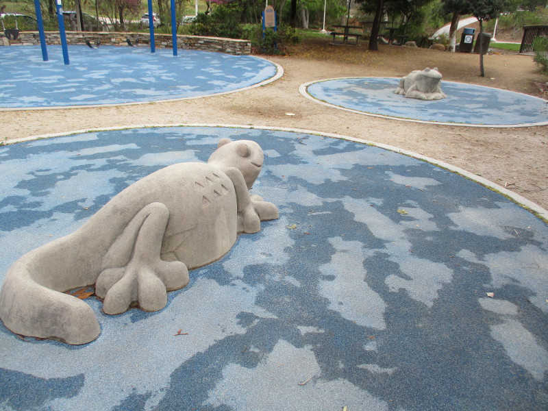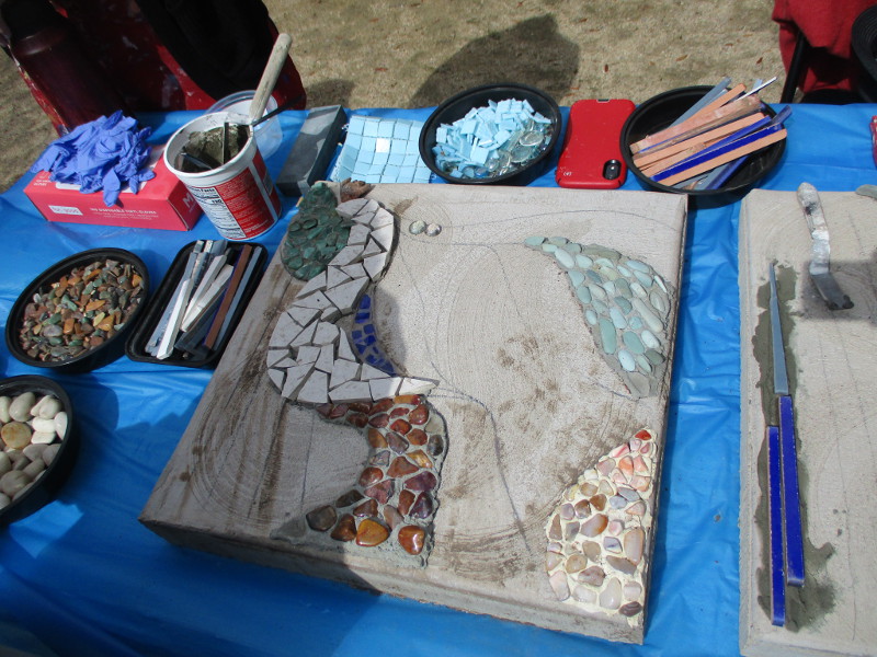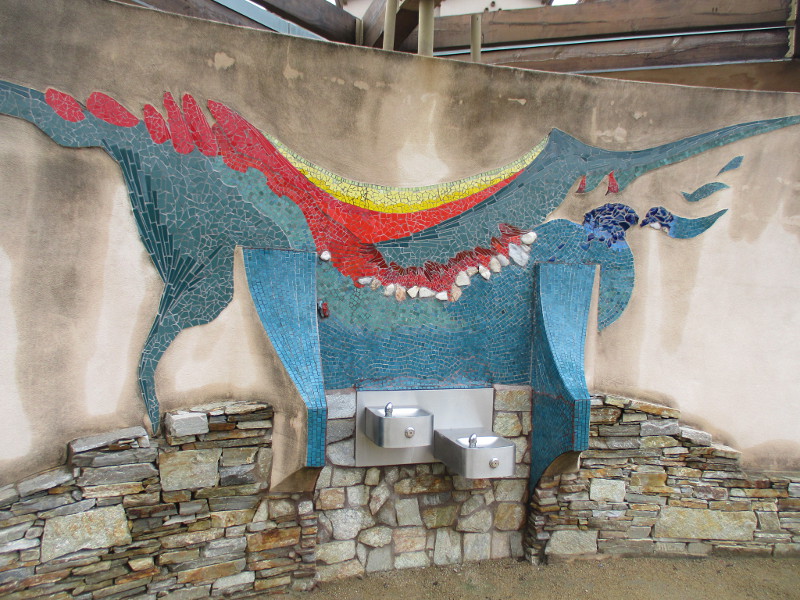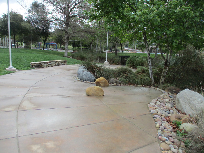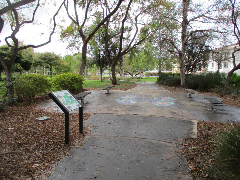 This butterfly glass mosaic was assembled by Emilie Ledieu, one of the artists in residence at James Hubbell’s Ilan-Lael Foundation, located near Santa Ysabel, California, in the mountains east of San Diego.One plaque on a park bench. Live Well – Love Much – Laugh Often…Many benches in the park were designed to accommodate people in wheelchairs.An herb garden, maintained by a local gardening club, provides a sensory experience. I smelled sage.The playground has numerous fun elements, including these critters.Path by the central wetlands, with lots of greenery and boulders and stone benches for meditation.An area of open grass. The unique restrooms are in the distance.Hubbell mosaics can be found on three sides of the beautiful structure, said to be the only park restrooms in San Diego with stained glass!Organic mosaic above and around drinking fountains appear a bit like a watery landscape.Mosaic on one side. The vertical blue lines are like cascading water.The other side. The flowing mosaic almost seems to have the shape of a heron.Stained glass window seen from inside the men’s restroom, made with durable resin.Tiles around another small garden space created by local school children.The very beautiful Hubbell labyrinth. One begins at water, passes through space, and arrives at the bright flaming center.Tables set up for the Open House tour visitors. That’s Emilie the artist in red. People could help build two small mosaics!One of the small example mosaics in progress.A smile!This looks like a very cool book concerning the history of this neighborhood. La Mesa’s Severin Grossmont Hills and Vicinity.We have gathered near the labyrinth for a talk at the beginning of the tour. Look at that sunlight in trees.That’s Glen Schmidt on the left and Drew Hubbell on the right, standing near a small climbing structure.Glen, the friendly landscape architect, explains concepts behind Briercrest Park’s creation.We look at one concept image board. Emphasized are accessibility, the senses, nature, serenity, and even music! I didn’t photograph it, but one area is equipped with outdoor chimes and other musical instruments to freely play.Drew Hubbell leads the way.We stroll through a very beautiful park.