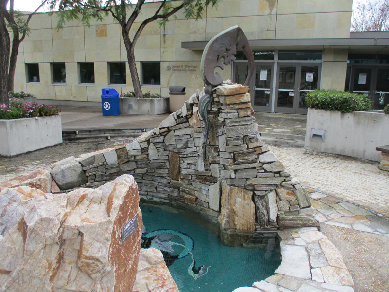 This public art in the Community Health Library’s outdoor courtyard is titled Moving Circles (O’s on the plaque). Water runs from the sculpture, then drips down from rugged stonework into a blue basin, where a watery mosaic ripples in the sunlight.