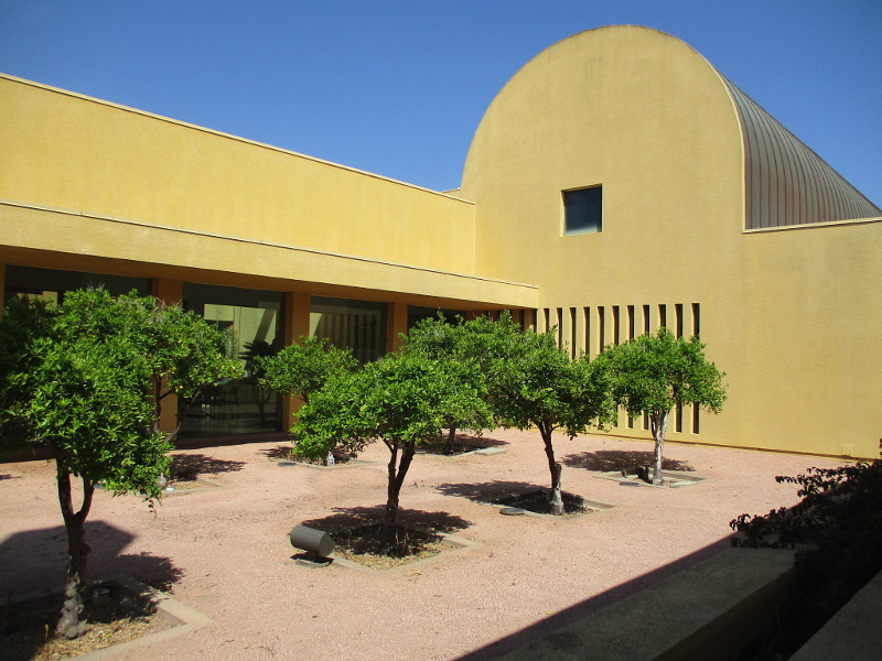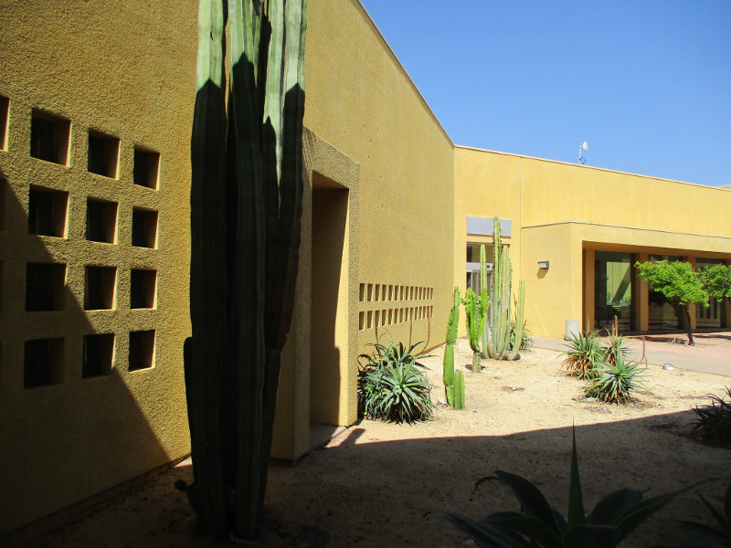 Wandering about, I was struck by the many basic geometric shapes that, joined together, help produce the library’s unique beauty. Colorful forms are contrasted with green plant life, and the many indoor and outdoor windows make the library feel like a fluid three-dimensional space that’s both intimate and part of a larger sunny world. Anyway, that’s what I felt. I felt inspired.