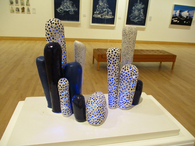 The museum galleries contain many unusual and experimental pieces that utilize a surprising variety of materials. As one might expect from college faculty, certain social, environmental and political themes were plentiful. I also saw examples of arresting beauty and art for art’s sake.