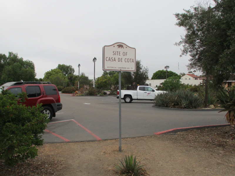 In a strip of landscaping between the parking lot and sidewalk stands a mysterious sign. The sign reads: SITE OF CASA DE COTA – HISTORICAL LANDMARK NO. 75.