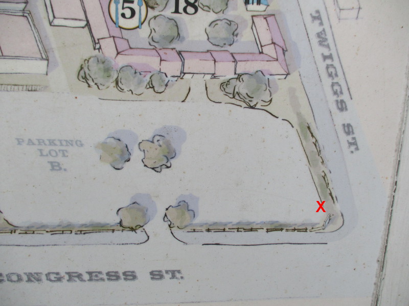 Visitor maps posted around Old Town San Diego State Historic Park show Parking Lot B, where the house once stood. I’ve included the following photo. I marked a red X at the mysterious sign’s location.