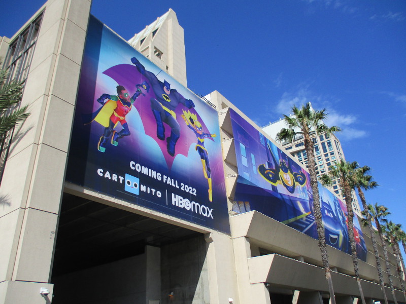 The Dungeons & Dragons: Honor Among Thieves offsite activation for 2022 Comic-Con is being prepared at Sixth and Island.The Star Trek: Picard offsite will fill the outdoor patio of Happy Does on Fifth Avenue. I noticed lots of cool graphics ready to be installed.A huge Severance building wrap is now being applied on the Fifth Avenue side of the Hard Rock Hotel. Your orientation begins here.At the NBCUniversal offsite, by the Tin Fish, those mastodon tusks look rather familiar. Didn’t I see them here during Comic-Con Special Edition?Now that the Padres have finished their home series with the Diamondbacks, workers have begun putting up big wraps on Petco Park. I learned this one will promote The Rookie.The Star Trek wrap over on the Marriott Marquis is beyond awesome.Another corner of Petco Park getting started.This will be the entrance to the FX offsite near the Hilton San Diego Bayfront, behind the convention center. Looks amazing.I see a columned building and a stringy tunnel in the FX labyrinth. Various shows will be promoted.It looks like a small nursery along a stretch of the bayside boardwalk. Lots of trees and shrubs are being used for this year’s epic FX activation.Vendors are now unloading their stuff in a parking lot behind the San Diego Convention Center. The massive Comic-Con move in has begun!At the Bandai offsite near the Marriott Marina, something has emerged from a crate. Are those two huge limbs that belong to Great Ape Vegeta?Here’s a better look at the Batman Cartoonito banners on the parking structure of the Manchester Grand Hyatt. They went up yesterday.Looks like a combination of Batman and the movie Cars.Here comes another gigantic wrap on one side of a silvery Marriott Marquis tower. It promotes The Lord of the Rings: The Rings of Power!The CW has banners all over the place advertising The Flash and Superman & Lois.The Gray Man offsite is taking shape. You can see parts of the race/obstacle course. You better put on some fast shoes!I learned this is the beginning of the Peanuts offsite. Their pop-up will be called All Things Armstrong. That Charlie Brown orange looks familiar.Beavis has arrived in San Diego. Butt-Head can’t be far behind.HBO’s offsite promoting upcoming series House of the Dragon looks cooler and cooler as time goes on. Was San Diego suddenly transported to medieval times?Even downtown’s Ace Hardware is getting ready for Comic-Con!