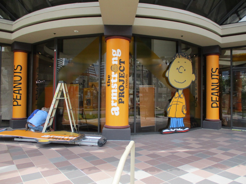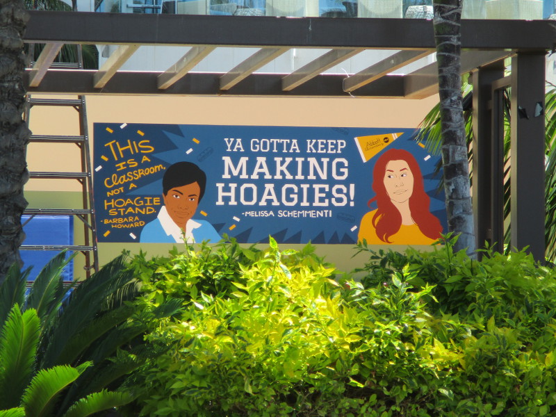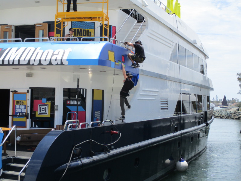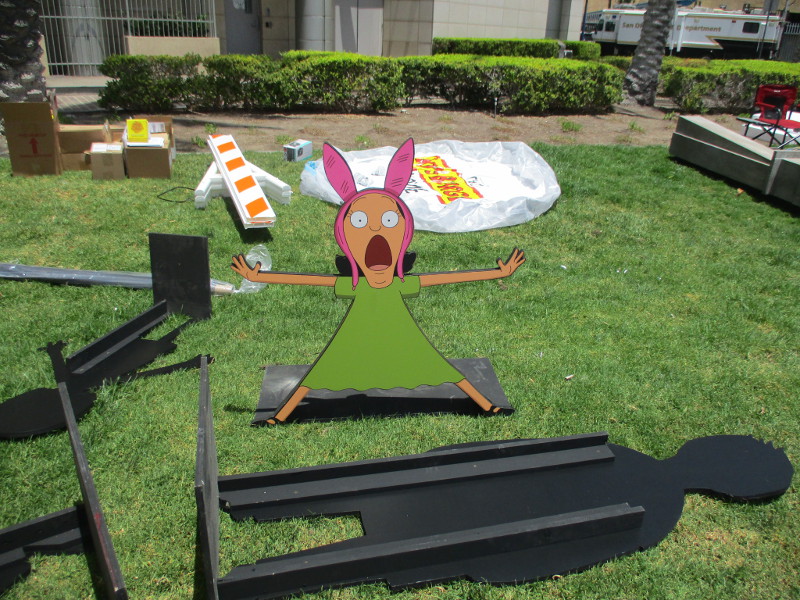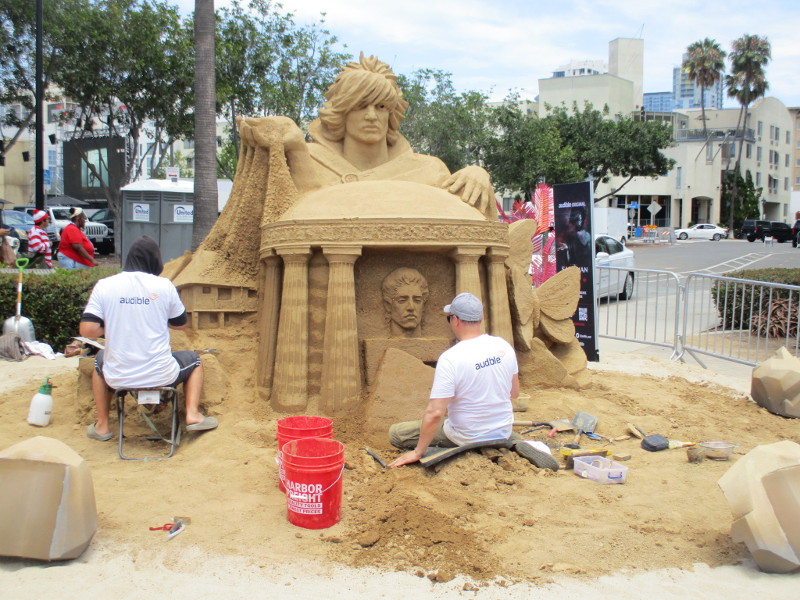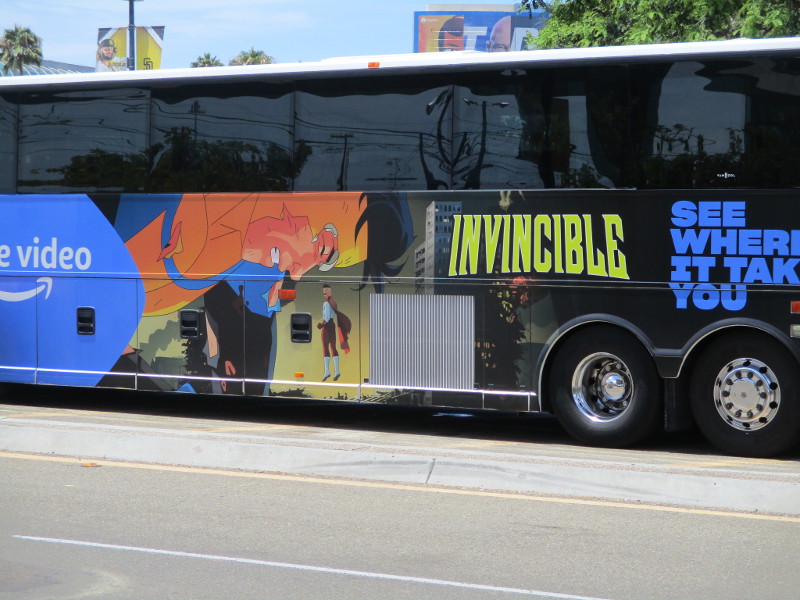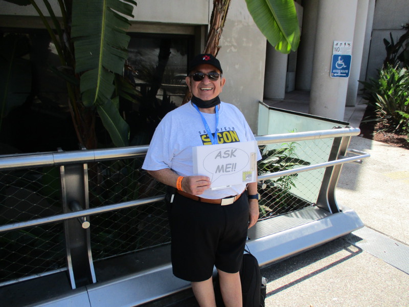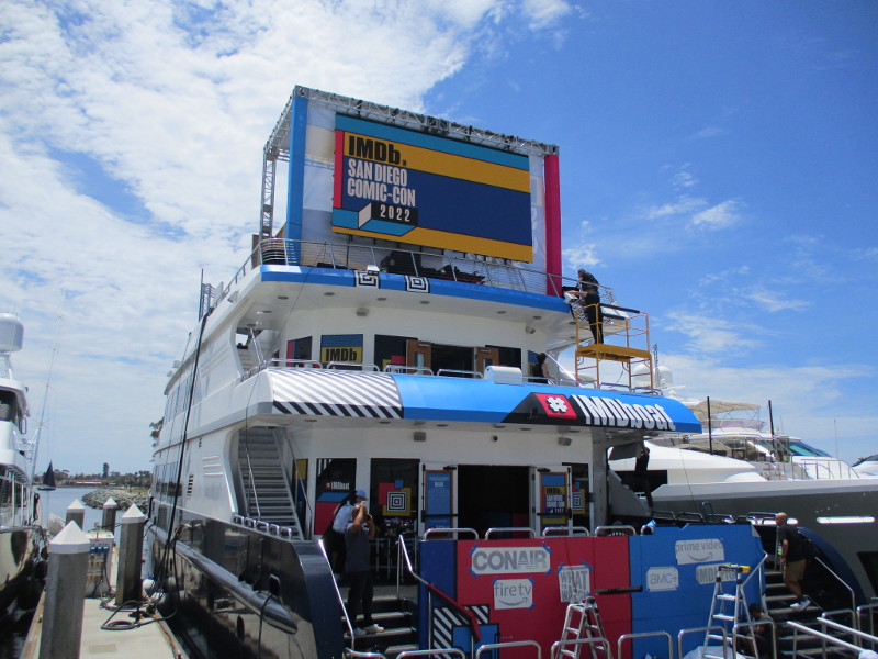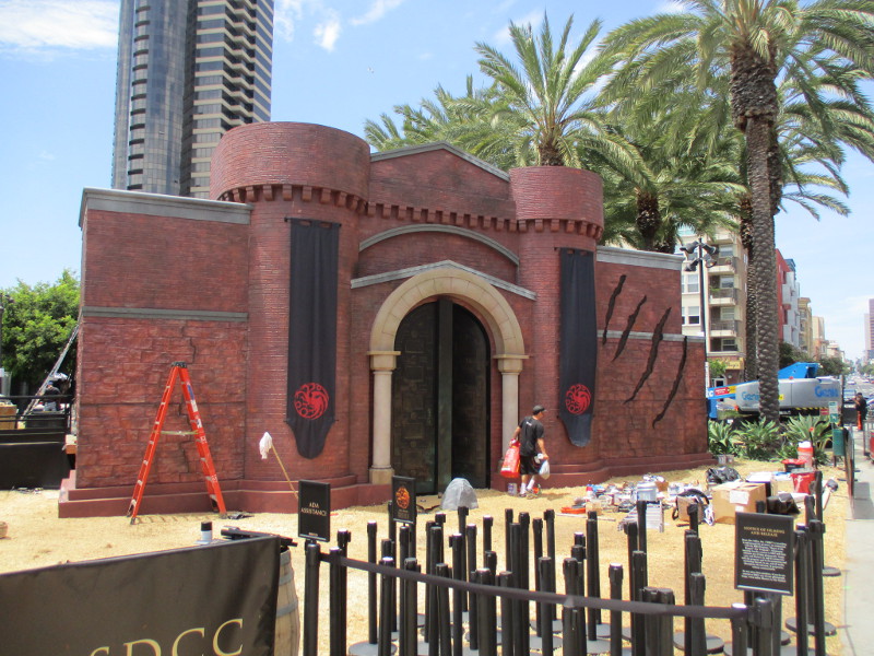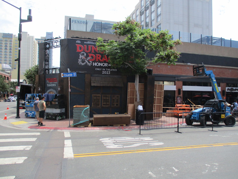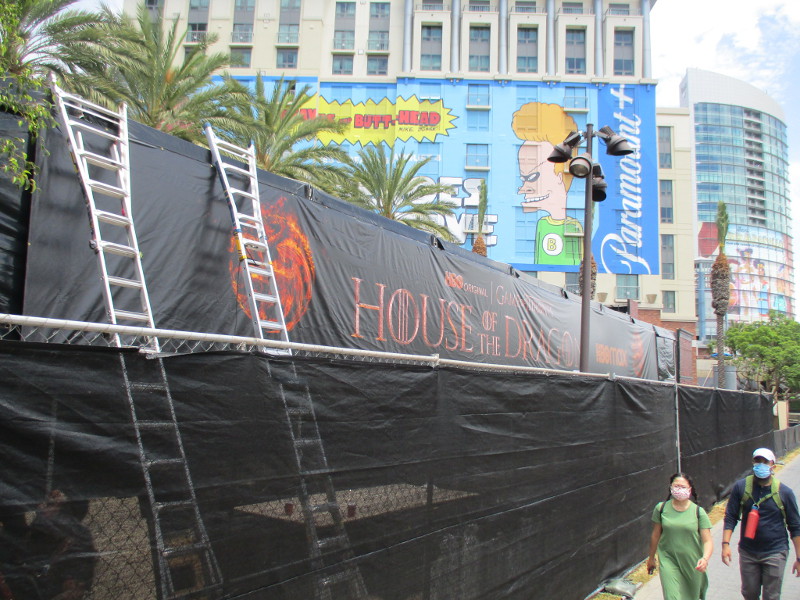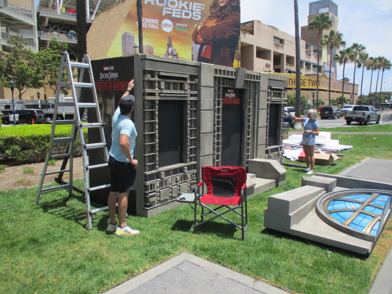 Barriers are being set up on Fifth Avenue just north of the convention center. This section of street will be cosplay central beginning tomorrow!Someone attached a memory from last year to the Tin Fish restaurant sign. This is where the SDCC Shrine was located during the two years Comic-Con was cancelled due to the COVID-19 pandemic.An offsite by the Omni hotel is setting up. Looks pretty crazy at the moment.And just down the walkway, Bob’s Burgers was setting up their Comic-Con activation.Getting the Sanctum Sanctorum ready! A small offsite promotes the recent movie Doctor Strange in the Multiverse of Madness.The hotel shuttle buses this year all have Amazon Prime Video wraps on them. This one promotes Invincible.A helpful smile and an answer awaits!A little detail work to ready the big FX offsite.All sorts of graphics are now up at ABC’s Abbott Elementary offsite.Oh, look! That is this year’s Adult Swim on the Green.I’ll keep it a mystery.Workers were putting up big graphics on the IMDboat.Yikes!Getting the Voodoo Ranger IPA “pirate ship” ready!The Gray Man offsite is ready, just waiting for the big crowds tomorrow. I was told the race/obstacle course itself is relatively short. But once inside it’s definitely cool looking!The Audible sand artists are running out of time!A big smiling Franklin Armstrong has appeared on the windows of the Peanuts offsite.A long banner has been added to the MLK Promenade side of the House of the Dragon.And the front of the castle is beyond awesome. Look at those doors!Getting the Dungeons & Dragons tavern ready. They better hurry up!