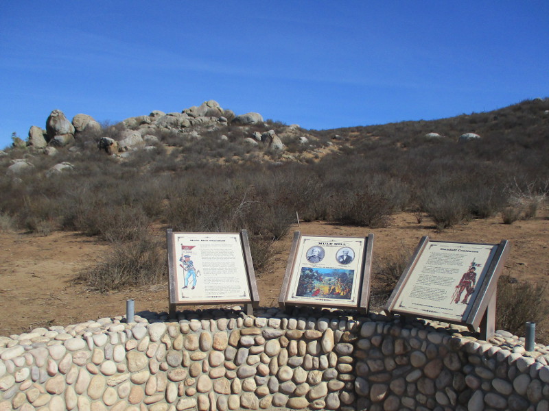 We’ve arrived at three signs near a pair of rock outcroppings that figure in the early history of San Diego. The signs explain what happened here at Mule Hill.