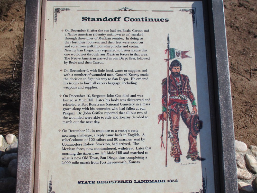 On December 11… A relief column of 100 sailors and 80 marines, sent by Commodore Robert Stockton, had arrived. The Mexican force, now outnumbered, withdrew. Later that morning the Americans left Mule Hill and marched to what is now Old Town, San Diego, thus completing a 2,000 mile march from Fort Leavenworth, Kansas.
