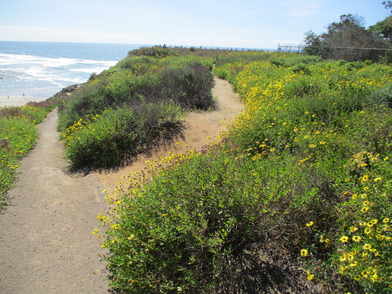 Once I reached the top of the main path, an amazing field of early March flowers and wide views of the Pacific Ocean awaited me.