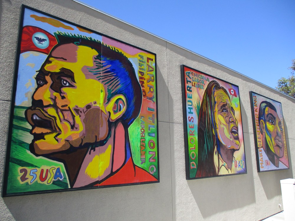 The colorful faces depicted in these outdoor murals belong to labor and civil rights leaders: Cesar Chavez, Larry Itliong, Dolores Huerta, and Martin Luther King Jr. The faces of these cultural icons are rendered in Torero’s distinctive style.