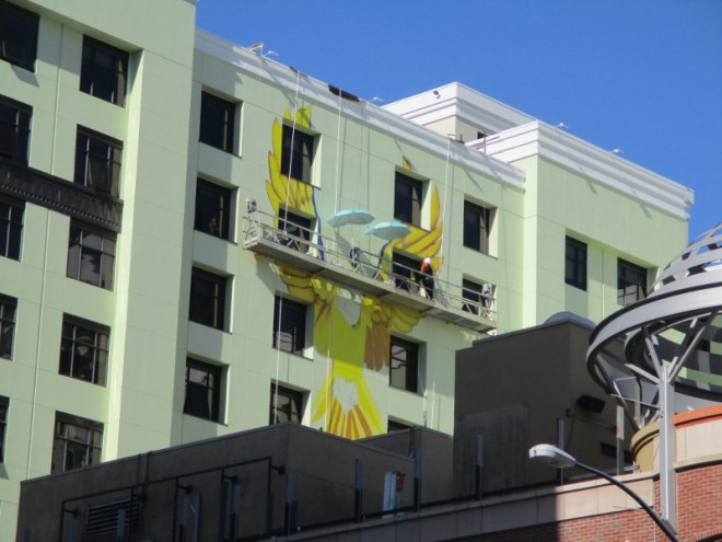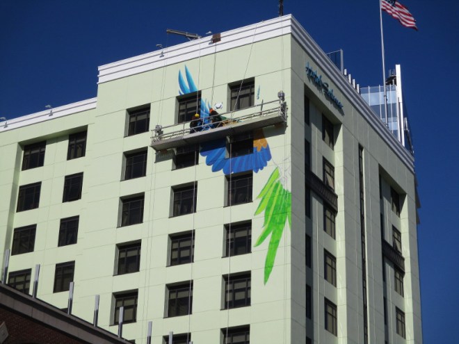I spotted the new artwork this morning, then returned in the afternoon for more photographs. Several painters were on two suspended platforms creating the huge, colorful murals.