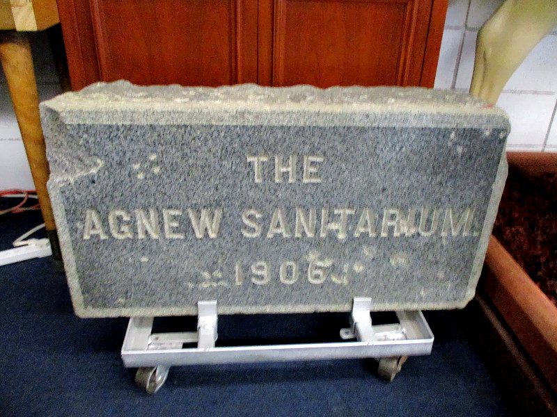 The cornerstone you see in my photograph was laid for a big new building at 464 Beech Street on June 9, 1906. You can see a postcard image of the Agnew Hospital and Sanitarium and more description of its history here.