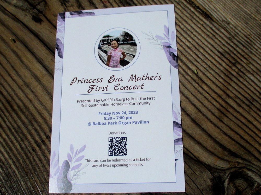 Eva Mather, young vocalist, singer and actress, will be performing in San Diego at the Spreckels Organ Pavilion in Balboa Park on Friday, November 24, 2023. Her concert will benefit a project that helps those who are homeless.