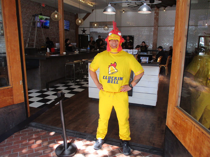 More building wraps are appearing in the Gaslamp Quarter and near the San Diego Convention Center. Glimpses of outside pop ups and other fun stuff can now be observed, such as the above smiling chicken . . . or is that someone trying out a Cluckin’ Bell costume?