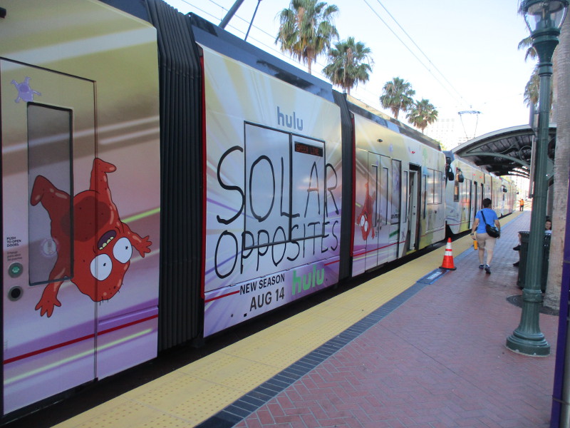 So many San Diego Trolley cars now have Comic-Con wraps that entire 3-car trains often display the same fun graphics…