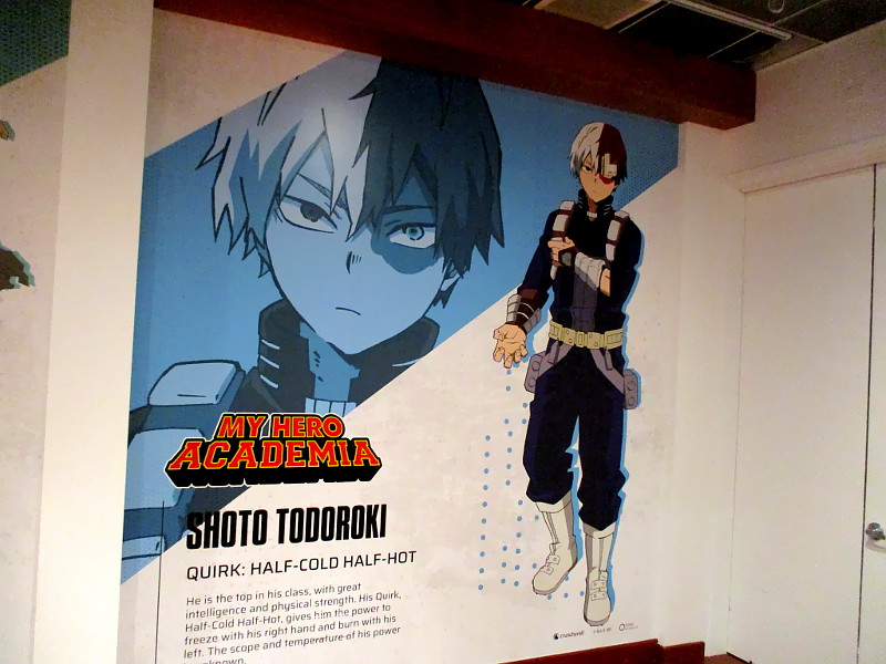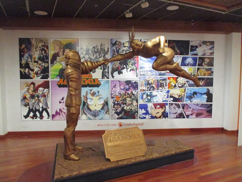 I’m not all that familiar with this manga series, but the colorful displays definitely caught my attention this morning as I wandered about the lower level of the museum. Around the statue are action-packed graphics that depict various characters and scenes that fans love from My Hero Academia.