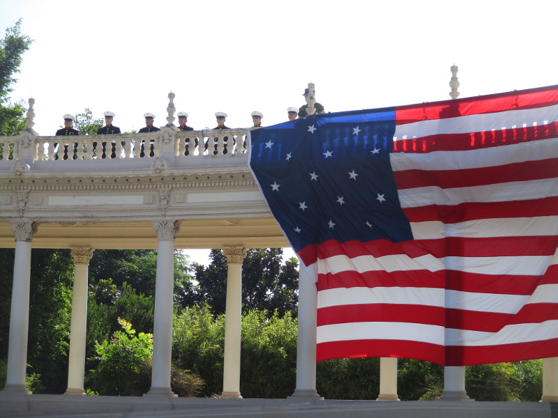 As I sat in the front row waiting for the event to begin, a gust of wind on the stage blew over our nation’s flag. Several people immediately rushed forward to raise Old Glory again.