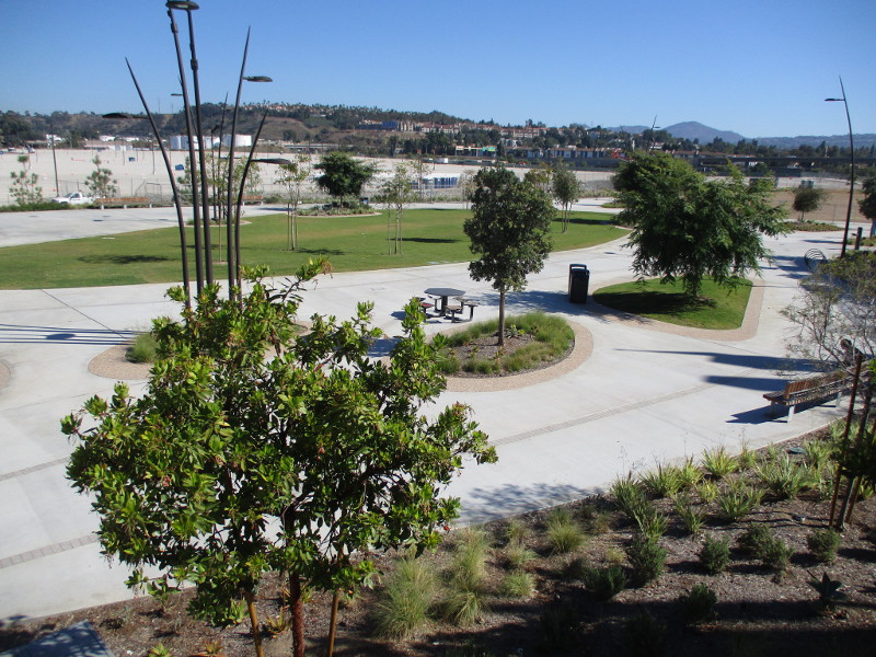 I stepped off the trolley at the Stadium station today and walked around. The area north of the station, where people can relax on benches on their way to and from Snapdragon Stadium (or future SDSU classrooms and dorms), is now open, green and inviting. You can see how this area looked when I took photographs back in March. Click here.