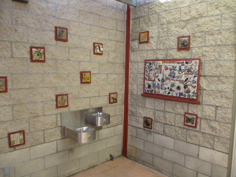 Many tiles are mounted individually to the walls. Others are combined to produce murals demonstrating the different habitats of Tecolote Canyon.