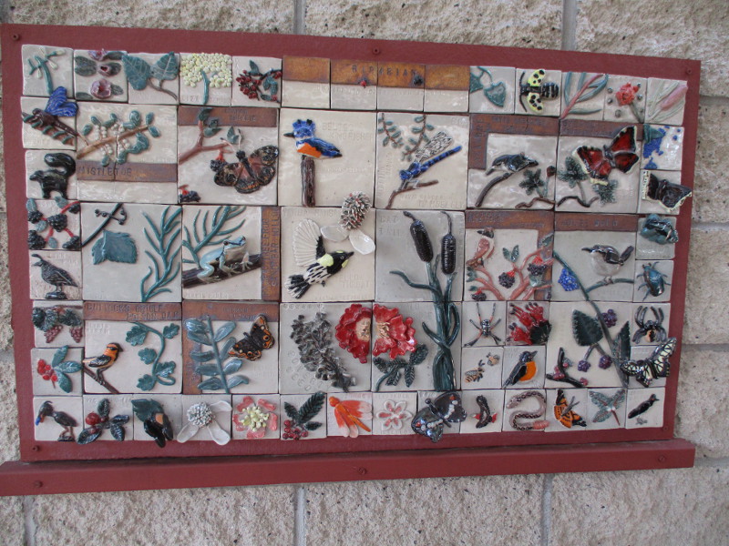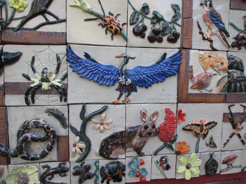 Take a look at this wonderful sculptural artwork. I photographed some of the tiles–there are birds, mammals, reptiles, insects, butterflies, flowers…