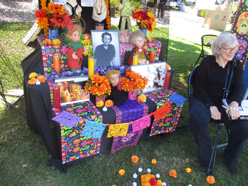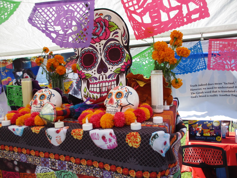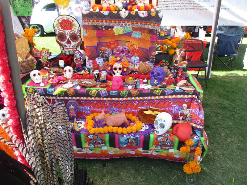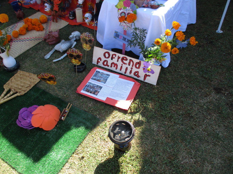Neighbors circulated through the park, viewing the altars, reliving precious memories. Departed loved ones looked out from photographs. There was the traditional pan de muerto, papel picado, favorite objects of those who’ve passed, candles and crosses.