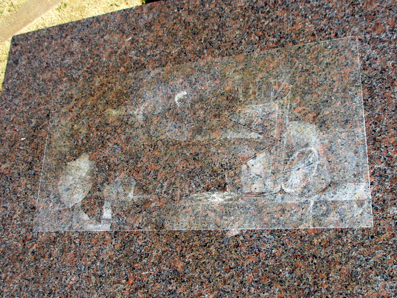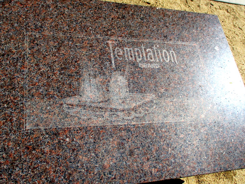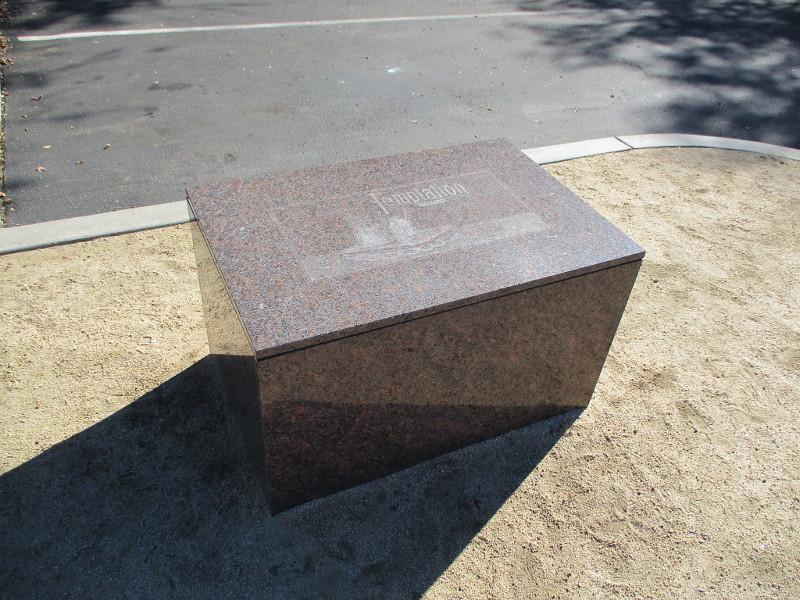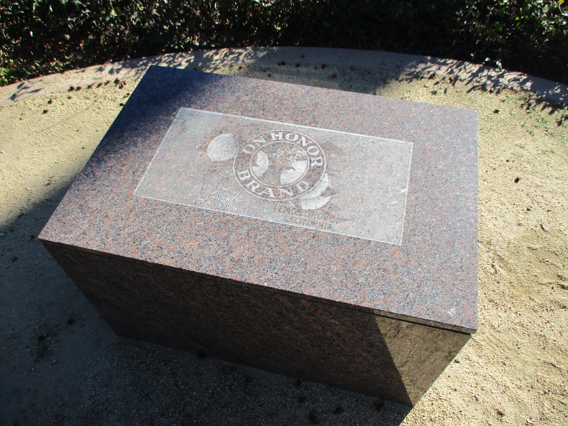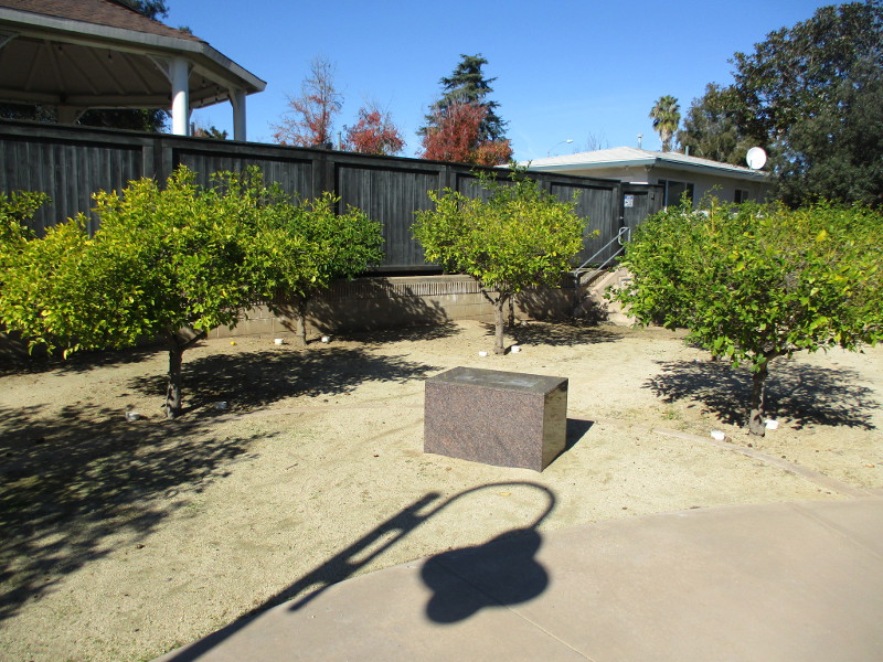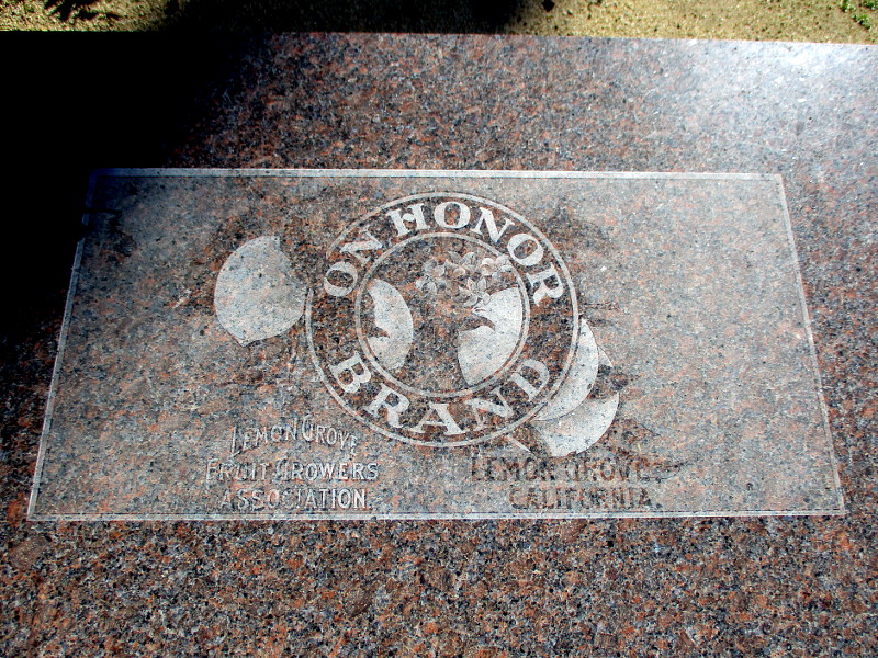 Three simple structures (that I found) seem to have been constructed for seating. Each resembles a fruit packing crate made of marble, and each features a unique lemon growers brand label. Two brands that are recognizable are On Honor Brand and Temptation Brand.