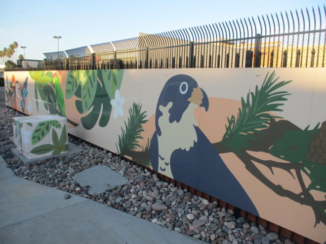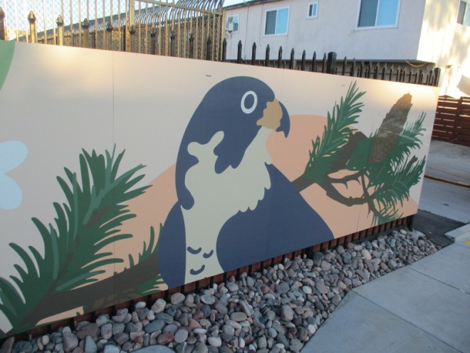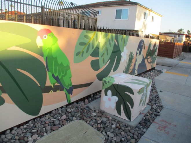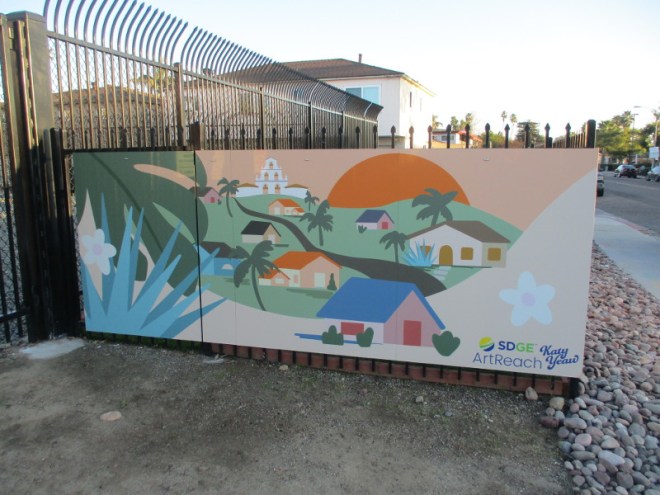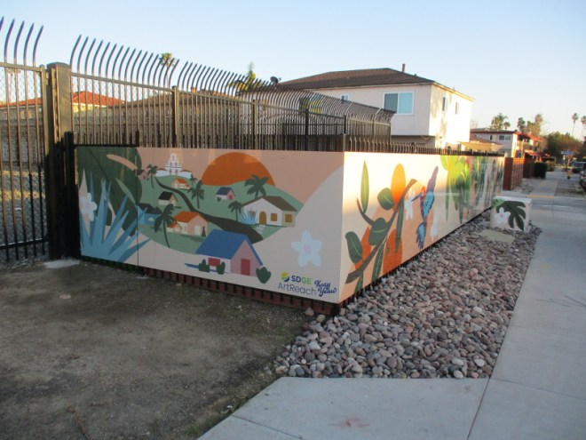 Depictions of homes in the community, nearby San Diego State University, and familiar plants and animals enliven a wall on 62nd Avenue, a block south of El Cajon Boulevard. The mural was created in partnership with SDG&E, whose substation is located here.