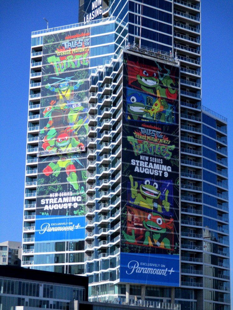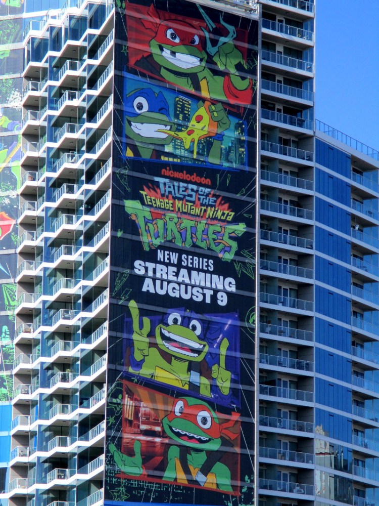 First, I noticed the tall Park 12 high-rise near Petco Park has a humungous double building wrap promoting Nickelodeon’s Tales of the Teenage Mutant Ninja Turtles, which will be streaming on Paramount+ on August 9.