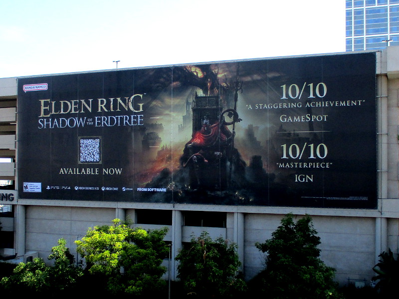 On the Harbor Drive side of the Hilton San Diego Bayfront hotel parking garage there’s now a big banner advertising the video game Elden Ring Shadow of the Erdtree.