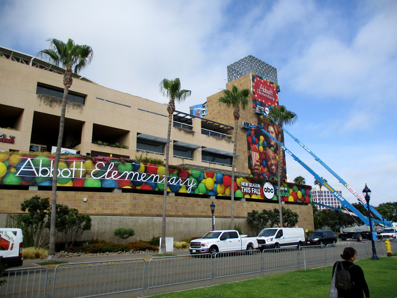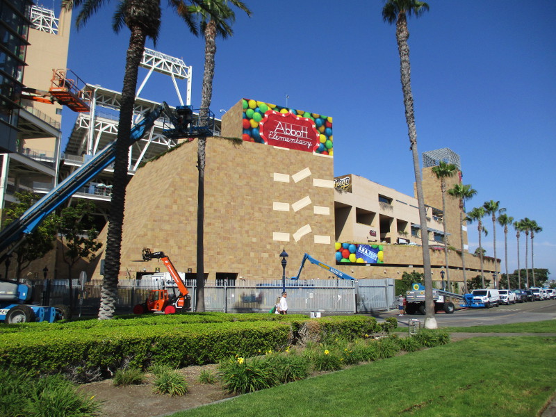Large building wraps that promote ABC television’s series Abbott Elementary are now being applied to the exterior of Petco Park for Comic-Con 2024!