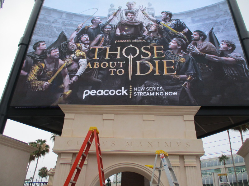 The whole experience promotes Peacock’s new series Those About to Die. As you can see in the next photo, the new Gaslamp Square video screen operated by MTS is showing an advertisement for the Roman gladiator show.