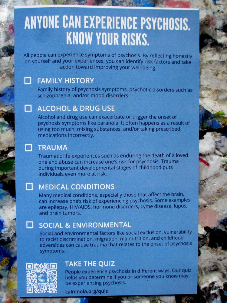 There’s an online quiz anyone can take that help determine whether you or someone you know may be experiencing psychosis. The quiz can be taken anonymously. If you’d like, you can reach out afterward for support. Find the quiz by going to the CALM website here.