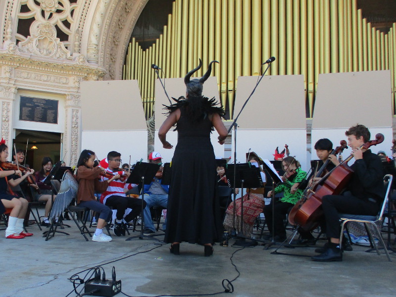 This afternoon, the San Diego Youth Symphony took to the stage at Balboa Park’s Spreckels Organ Pavilion, to perform their traditional Halloween concert. And many of the young musicians were in costume!