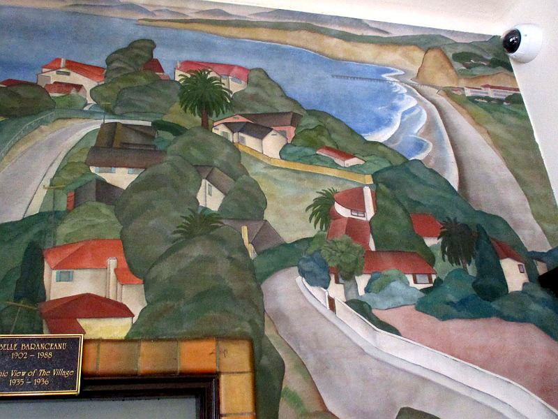 A stunning mural decorates the lobby of the United States Post Office in La Jolla. The historic mural is titled Scenic View of the Village. Completed in 1936 by renowned artist Belle Baranceanu, the 15′ x 12′ oil on canvas painting depicts part of La Jolla, looking down curvy Hillside Drive toward the Pacific Ocean.